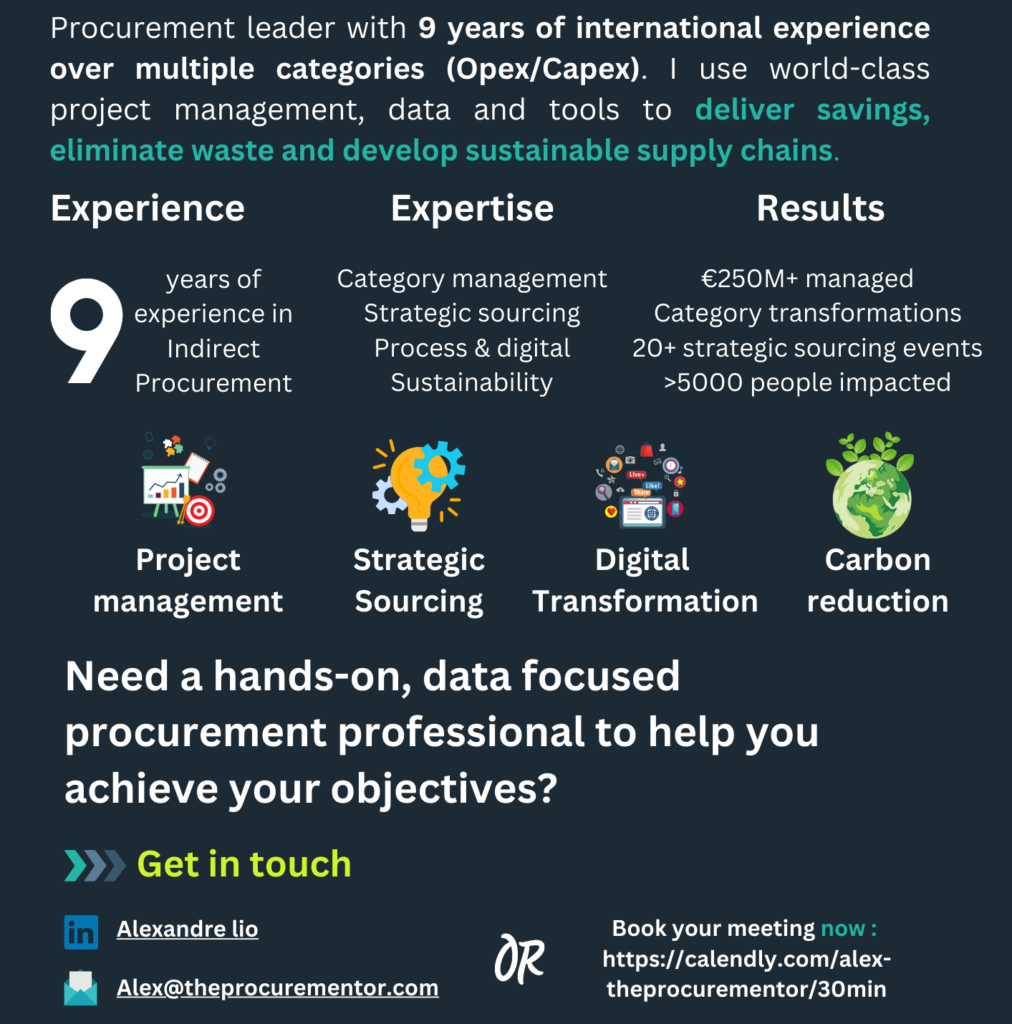Alex has supported us through multiple projects where he has brought the procurement methodology to deliver savings and helped transforming our ways of working. He contributed to revamping our maintenance processes; outsourcing services and setting up the bases for a sustainable supply chain from scratch.
