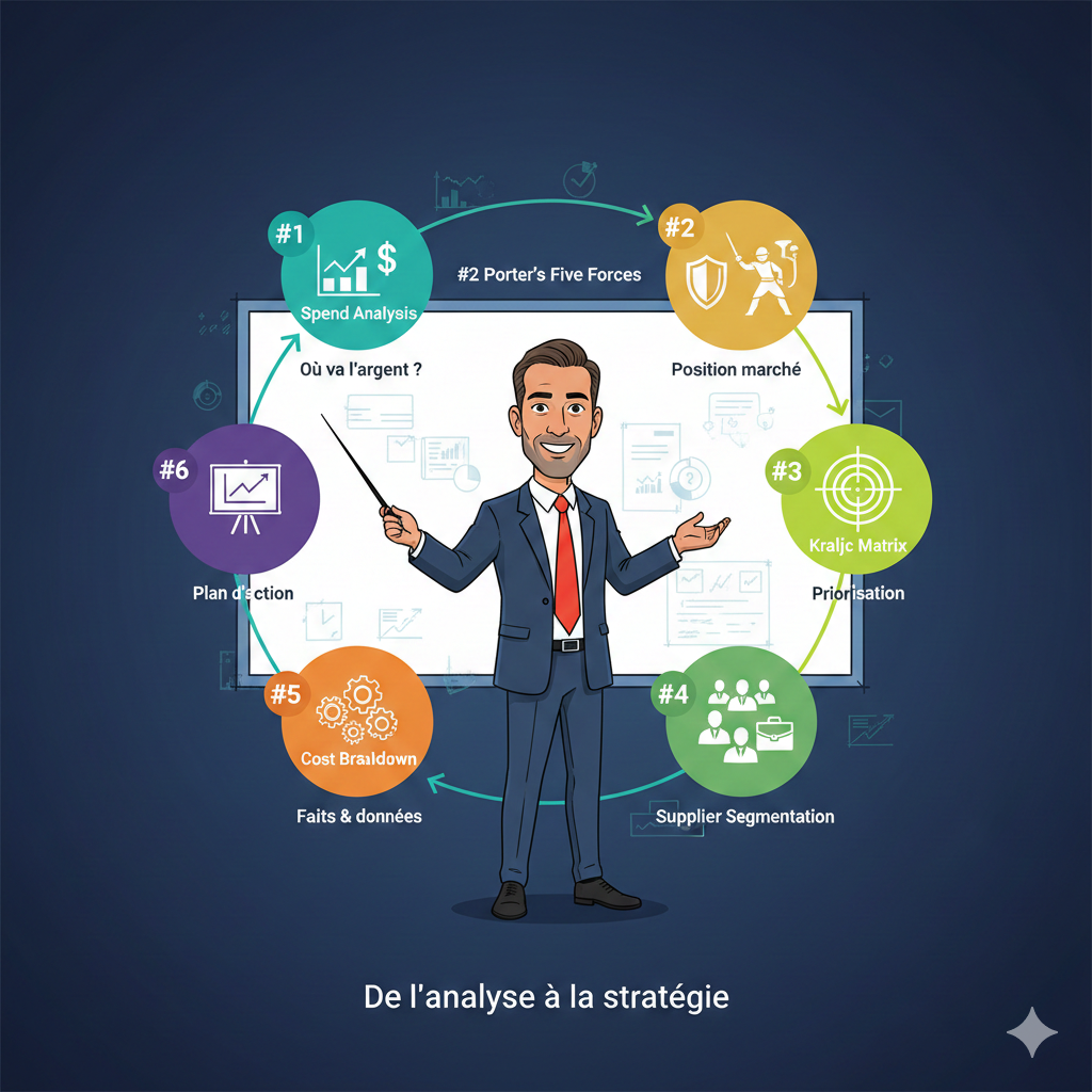 Les 6 outils que tout category manager doit maîtriser — et l'ordre exact pour les utiliser. Du spend analysis au canvas stratégique, en un seul guide.